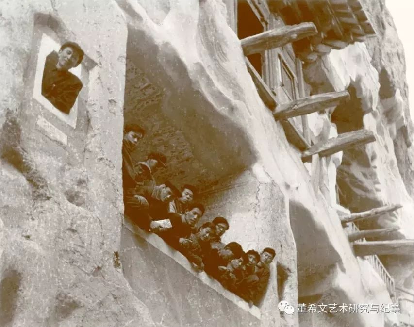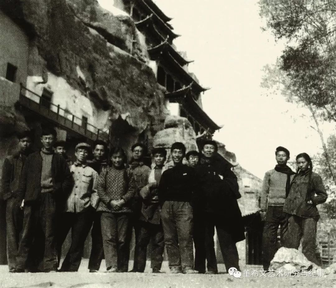 图3 董希文带领学生在敦煌莫高窟考察 敦煌莫高窟是一座以古建筑、雕塑、壁画三者相结合的艺术宫殿,尤其以丰富多彩的壁画闻名于世。 莫高窟不仅是繁衍民族艺术的绿洲,也是董先生寻求艺术表现的摇篮。多年前董先生曾在这里对壁画进行过大量的、系统的研究和临摹。这使他加深了对民族传统绘画的理解,增强了探索油画民族化的信心和决心,体会到绘画创作要体现时代精神、反映民族情感和审美趣味;另一方面,就创作技法而言,在色彩方面,他力求在临摹时还原最初绘制时的色彩状态,为敦煌壁画的色彩研究做出了开拓性的探索。他指出,敦煌壁画是在原色对照中取得调和,在强烈对比中求得整幅色彩在交错中发散出来的色的光辉。