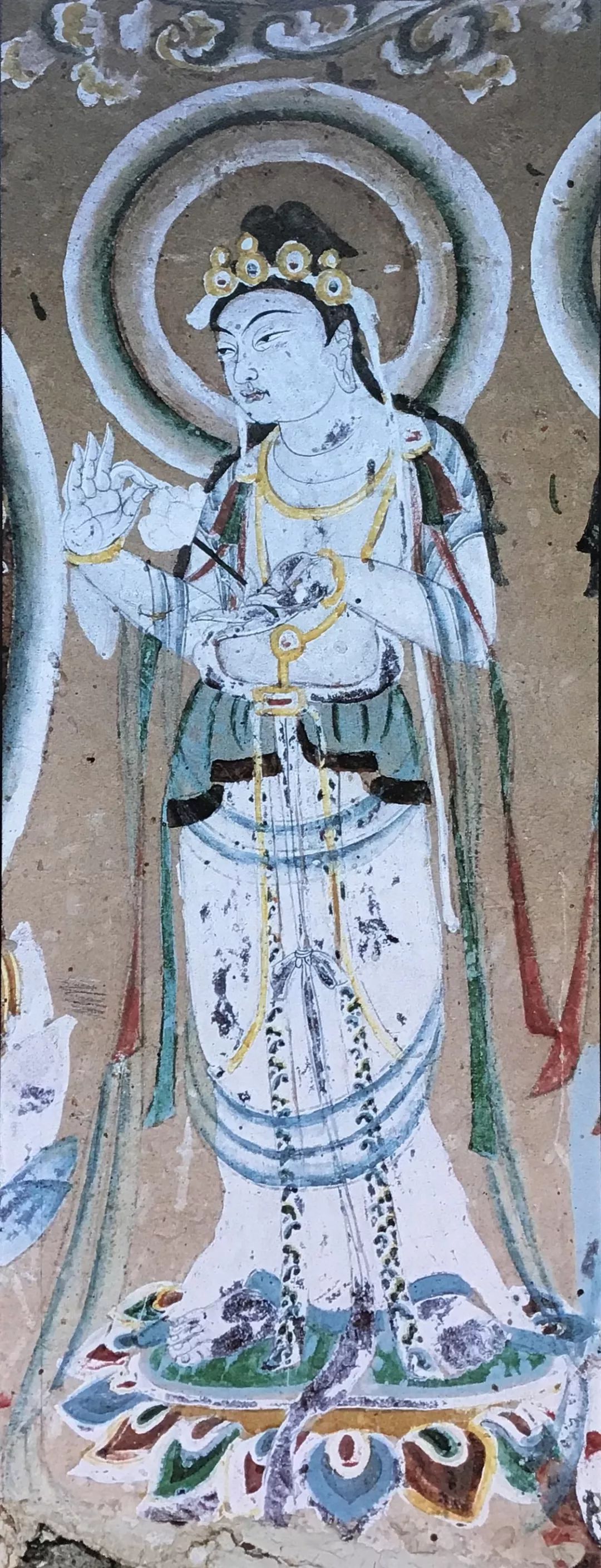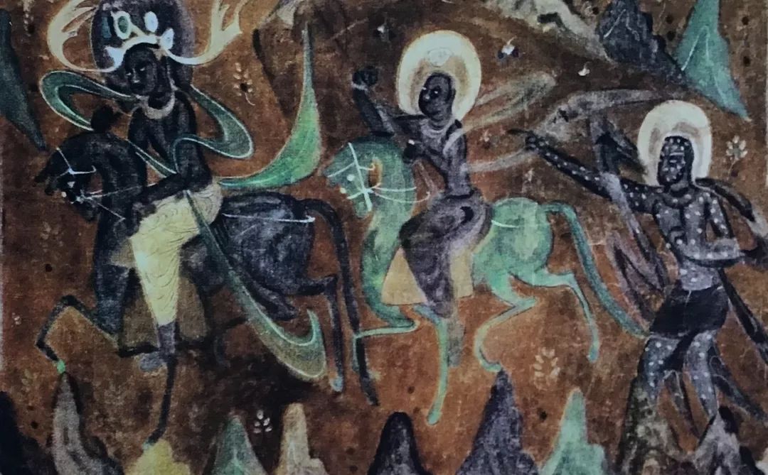 图8 敦煌莫高窟第249窟西魏时期《供养菩萨》 其特点有三: 一是线描造型。一支毛笔,无论采用什么描法,都能塑造出生动的艺术形象。线描与书法的用笔是一致的。运笔就是运力,运力就是运情。作者在描线时全神贯注,在抑扬顿挫、起承转合中体现出音乐的韵律感,也倾注着自己的全部情感。这是线描造形独有的中国的民族特色。 二是赋彩。敦煌艺术色彩鲜丽,以色素表现真实的生命力,不象西方的复色,而是随类赋彩的艺术想象的组合色。它既有现实的衣饰艳丽之色,也有石绿色的马、朱红色的力士、雪白的菩萨等等。