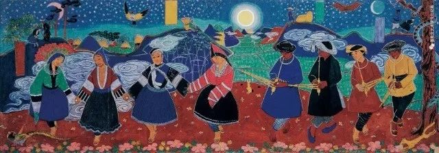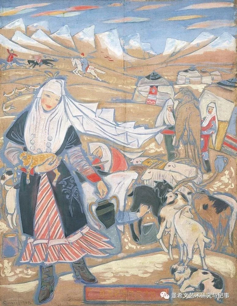 图15 董希文《苗民跳月》 1948年,他创作的《哈萨克牧羊女》明显受到敦煌壁画的影响,人物、动物、牧民帐篷等用线造型,均以平涂法敷色。