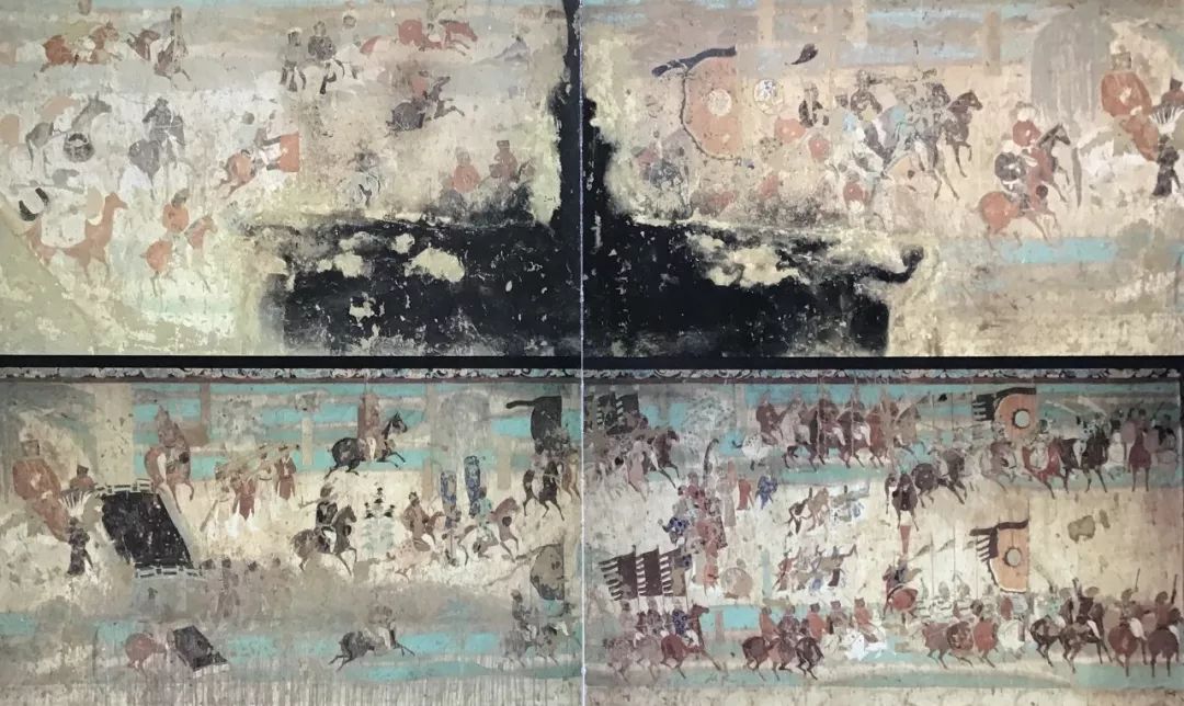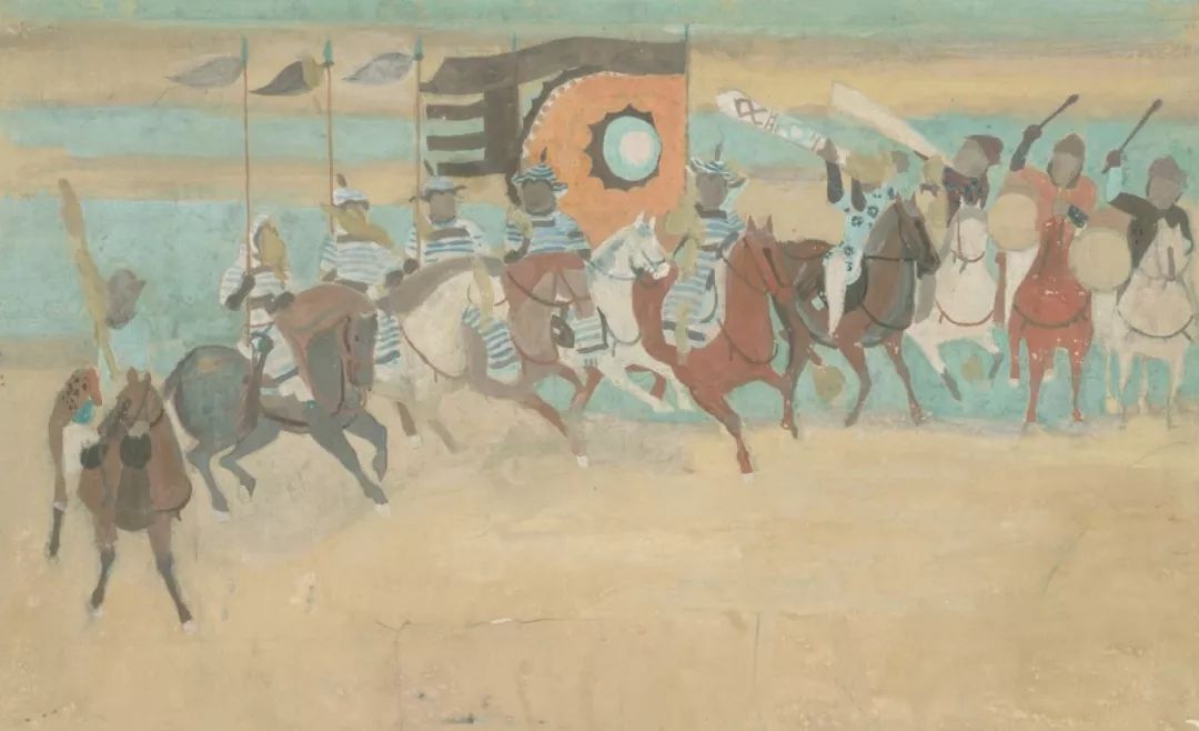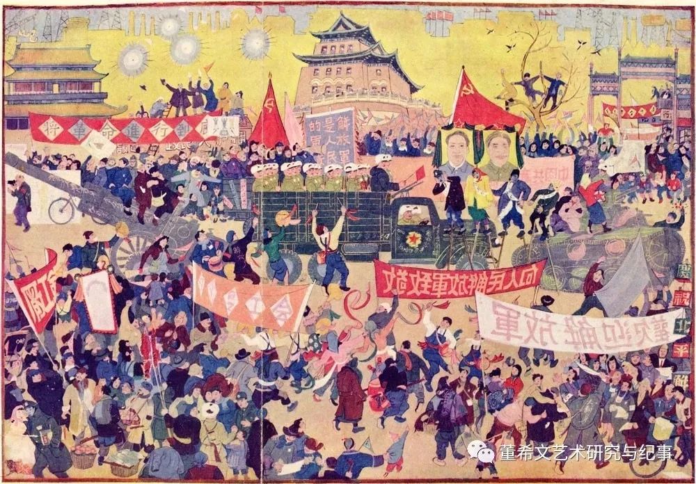 图17 董希文《北平入城式》 色彩与造型的重复性节奏造成的壮阔声势是敦煌壁画的一个艺术特点,被董先生成功运用在1960年完成的作品《百万雄师渡长江》中。
