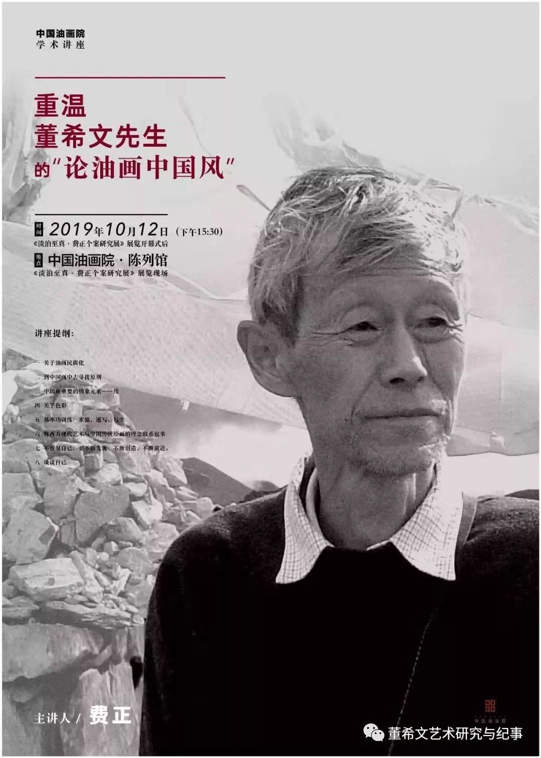 . 自 述 1957年我考入中央美术学院油画系,从本科到研究生,一共七年光景。四年级时我进入董希文工作室,此后的四年时间,一直是在董希文先生指导下进行学习。这四年,基本确立了我的发展方向,为我未来的艺术探索奠定了基础。这是我在艺术生涯中遇到的第一个变革,也是我艺术道路上的一个重要起点。是董先生让我明确了自己将要走的艺术道路。在毕业后的五十多年里,我在这条路上一直走到了今天。 我牢记董希文先生的教导,从塞尚出发,将西方的现代艺术和我们的传统艺术结合起来。我的创作立足于本土,没有盲目地去和西方接轨。我只是把西方艺术中对自己有用的元素吸收过来,以丰富我的艺术表现。我的作品依然是中国的。我认为中国油画家要从本土出发,以本土文化艺术资源参与和世界艺术的对话,本土始终要在我们心中。这就是我所坚持的中国油画之路。 费正 2019.10 ![]() 各位来宾、各位同行:大家下午好! 今天我讲课的题目是:“重温董希文先生的《论油画中国风》”。 所谓“油画中国风”,就是指在董希文先生艺术思想里,包涵着他长期以来一直追求的现代化思想。它的源头可以追溯到董先生的青年时期,在越南“法国国立安南美术专科学校”学习时,所受到的法国文化的影响。我将在下面各个章节中,凡是提到与董先生现代化思想的有关内容,都会加以明确的阐述。 我接受艺术教育始于二十世纪五十年代末至六十年代初。1957年我考入中央美术学院油画系,从本科到研究生,一共七年光景。四年级时我进入董希文工作室,此后的四年时间,一直是在董希文先生指导下进行学习。 受业于董先生门下,是我人生中一段珍贵难忘的经历。在他的指导和启示下,我逐渐理解了艺术、领悟了艺术。我的艺术道路的起点正是从这里开始的。