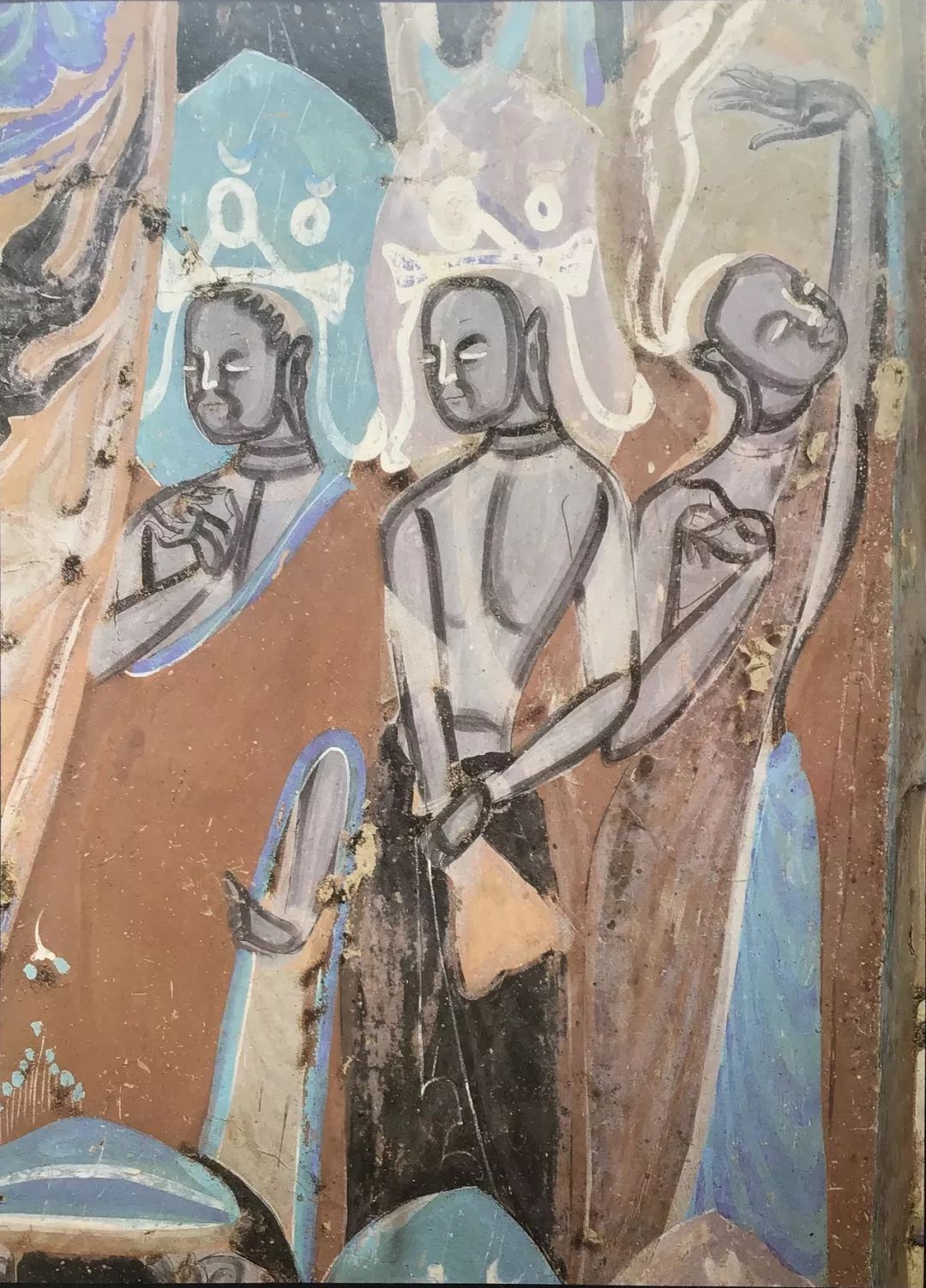 图11 雪白的菩萨:敦煌莫高窟第329窟《说法图 供养菩萨》 三是传神。传神就是通过外部形象来表达内心的情感。自从顾恺之提出以形写神的理论之后,一直是中国传统艺术最高的审美标准。敦煌石窟的塑像和壁画,人物的喜怒哀乐之情都通过面部表露出来,又与其的姿态、手势相互配合,加强了形体的风采,从而发展了古代艺术的传神思想。 我们来到莫高窟后,面对洞窟里的壁画,董先生仍抑制不住当年壁画给他带来的激动。他让每人自选一段壁画临摹,并分别予以指导。他为我们讲述被宗教束缚下的敦煌壁画中那些忽隐忽现的现实主义表现;讲述敦煌壁画的色彩规律、形式处理、艺术手法。同时,还为我们讲述壁画里的各种故事。